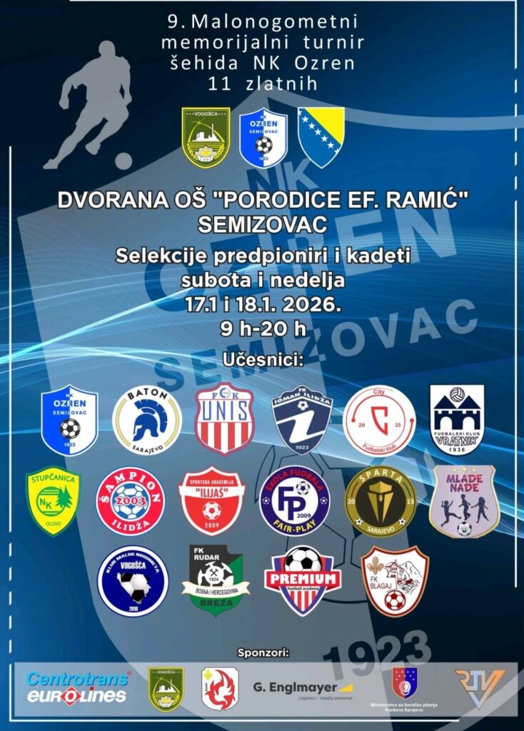 U Semizovcu kod Sarajeva u organizaciji nogometnog kluba „Ozren“ Semizovac u periodu od subote 17.01.2026. godine do nedjelje 18.01.2026. godine planirano je održavanje devetog po redu malonogometnog memorijalnog turnira šehida NK Ozren pod nazivom „11 zlatnih“. Turnir će se odigrati u dvorani Osnovne škole „Porodice Ef. Ramić“ u Semizovcu.